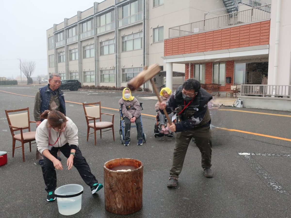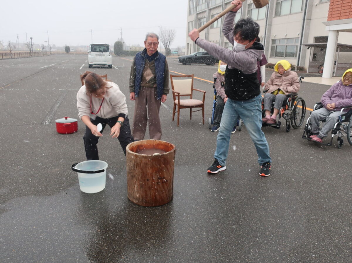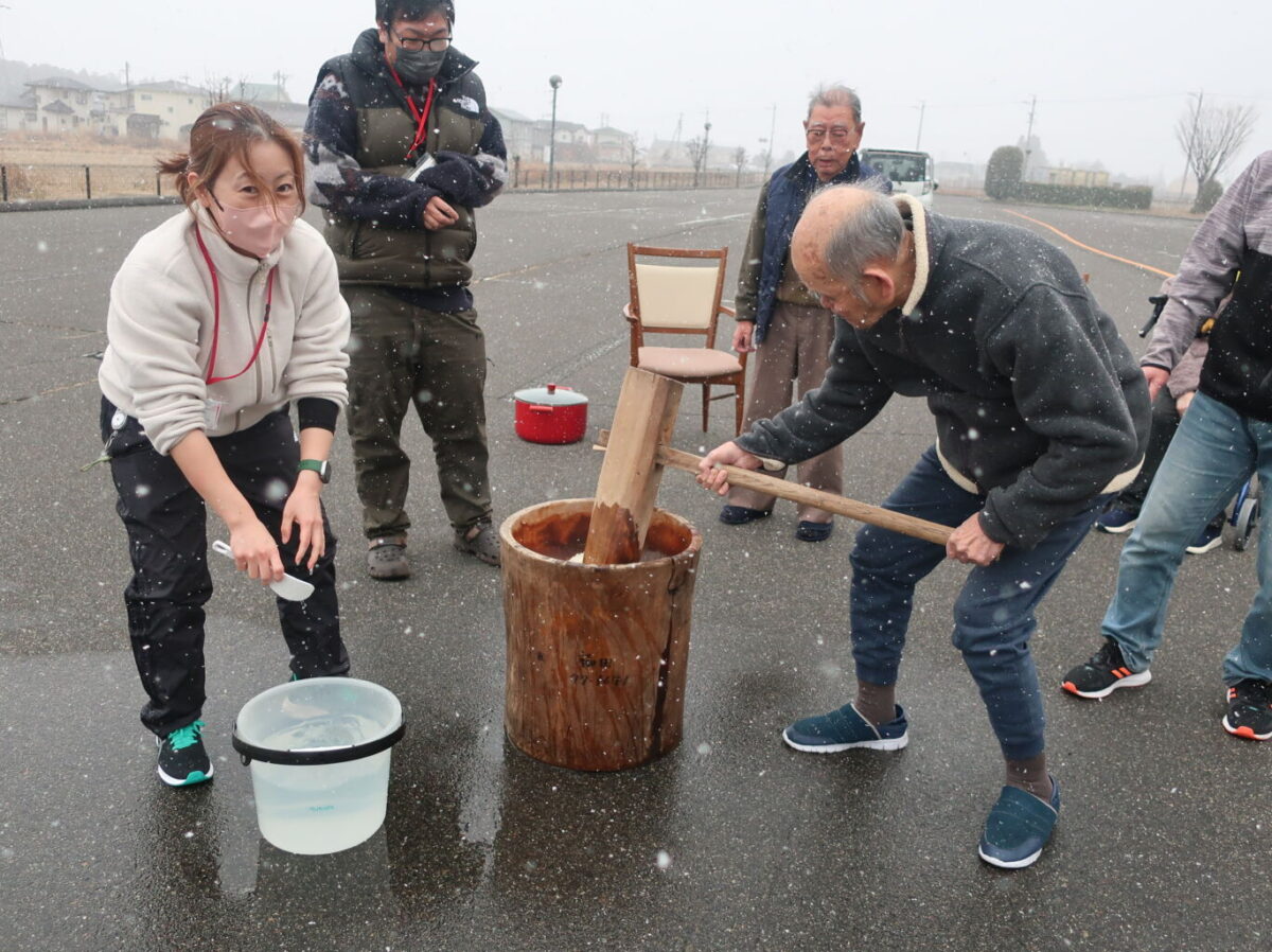 雪が降る中、「よいしょー!」の掛け声で代わるがわるお餅をつきました。
