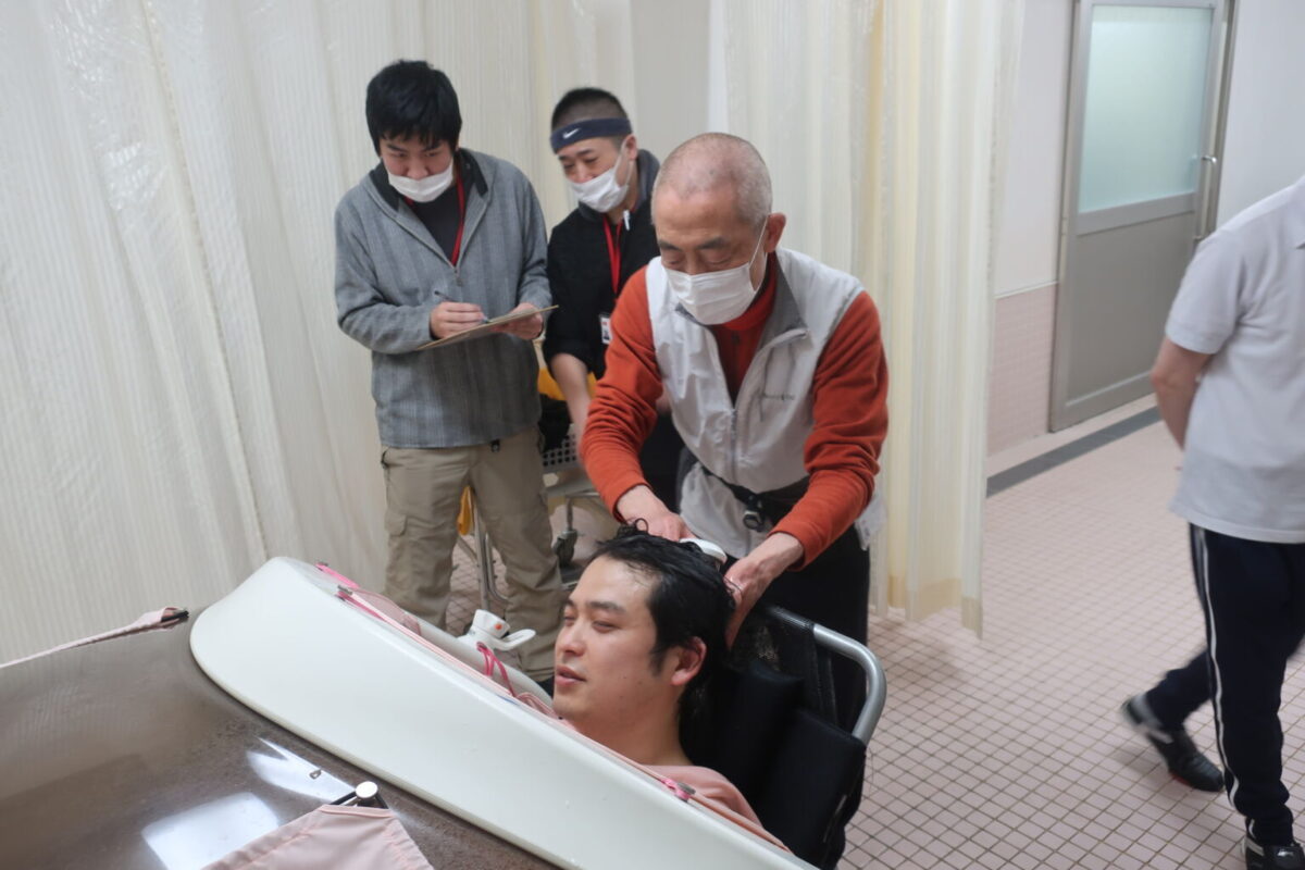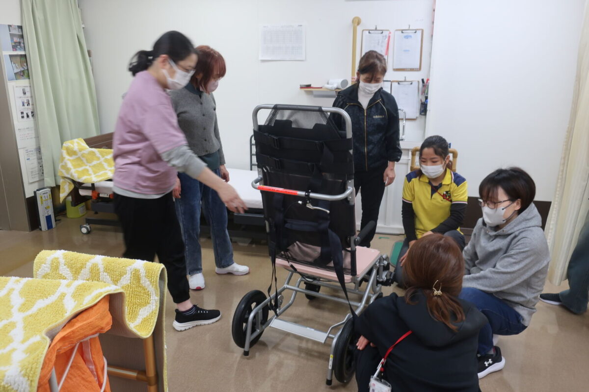 その後、実際にアラエルに入った職員の感想をもとに、専用チェアへの安全な移乗方法・操作方法を皆で確認し、どれくらい洗えるのか、どれくらいお肌がすべすべになるのか、女性職員が大挙押しかけ、アラエルに腕を突っ込んで洗っております。明日からの新しい入浴、ご入居者様にさらにご満足いただけるよう職員一同がんばります! (施設長 和田 愛)