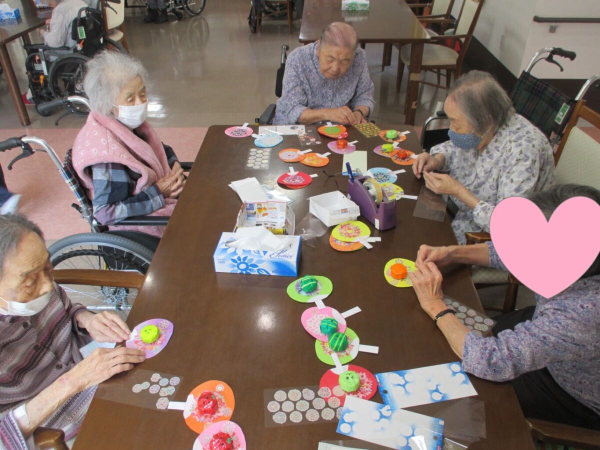 9月中旬実施の、夏祭りの飾り用の「ミニうちわ」をご入居者様と職員が一緒に作っています。「色の組み合わせは、この方がいいわね」や、「この風船飾りは、ここに貼った方がいいわね」とおしゃべりしながら作っておられます。「女3人寄れば、かしましい」とはこのことですね。実際には5人集まったので、もっとかしましいでしたが。。。                                        夏祭りが楽しみです。事故がないよう入念な準備をしてまいります。 副主任・山本 大悟