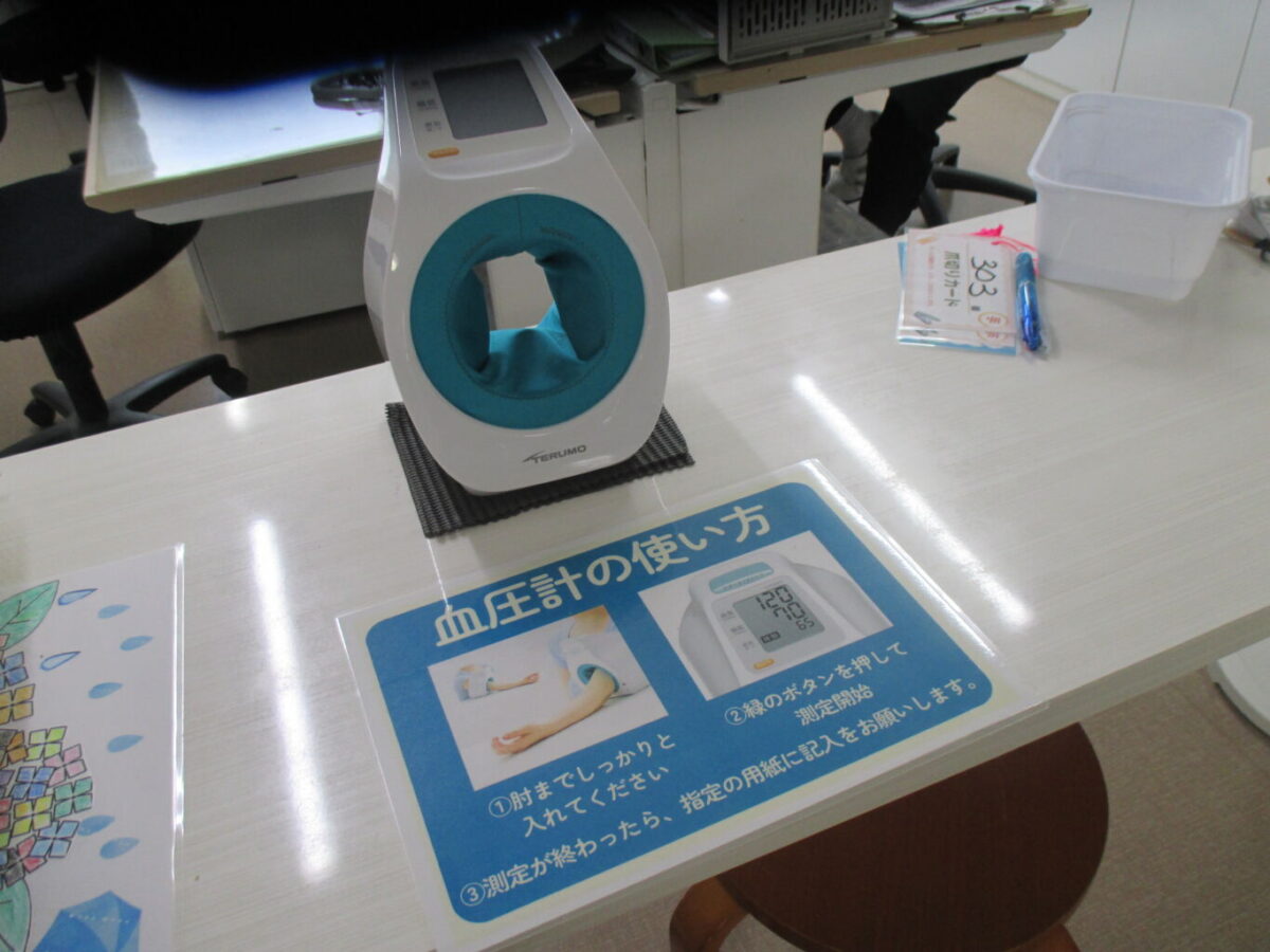 今月から「テルモちゃん」が登場しています。アニメ「ふしぎなメルモ」とは一切関係ございません。日ごろからご自身の体調管理をされているご入居さまにとって、「血圧」は大変重要なバイタルサインです。今までは、職員が血圧計を管理していたので、血圧を測りたくてもすぐに測れる状態になっていませんでした。しかし、この「テルモちゃん」であれば、職員の手を借りなくても、ご自分で測ることができます。また血圧を測るためにゆっくり歩いて来られる、自立支援、リハビリの一環にもなります。また、職員も腕にカフを巻いて計測する必要がないので、入浴前に大人数の血圧測定をする負担軽減につながり、ご入居者様、職員にとってメリットがあるだろうということで、試験的に導入しました。「テルモちゃん」の活躍を期待しています。がんばってね。 (施設長 和田 愛)