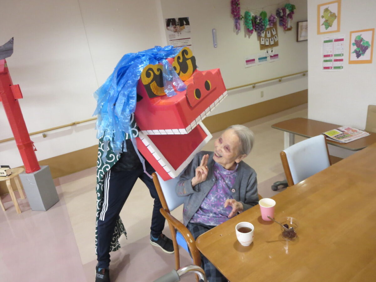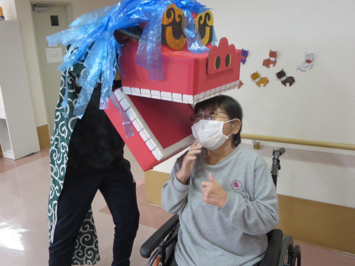 昔、私自身、獅子舞に頭を食べられたと大泣きした覚えがありトラウマですが、利用者様は喜んで下さっていました。