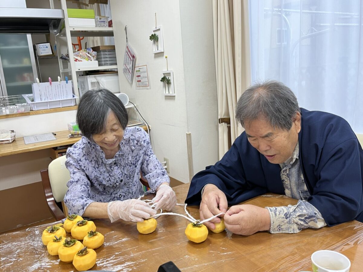 皆様、慣れた手つきでどんどん皮をむき、手際よく紐にくくり、あっという間に軒下に干されて、柿すだれが完成しました。