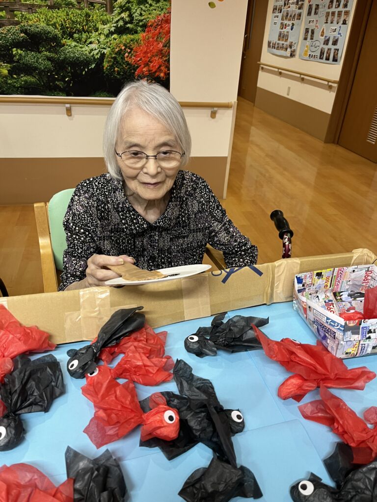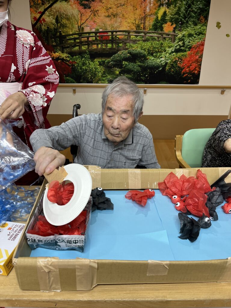 1階フロアでは「金魚すくい」を行いました。1つ1つ手作りした金魚を、皆様真剣にすくい取っておられました。その後は袋に入れてお渡しし、お部屋に飾られたり、車椅子に付けてくださったりと、しばらくは楽しんでいただけそうです。