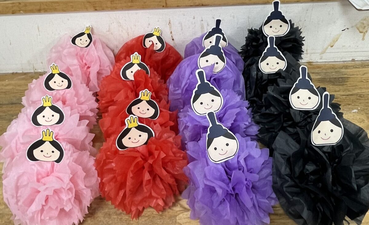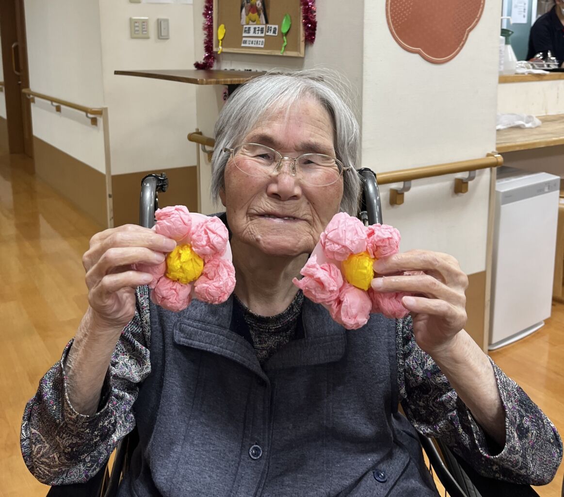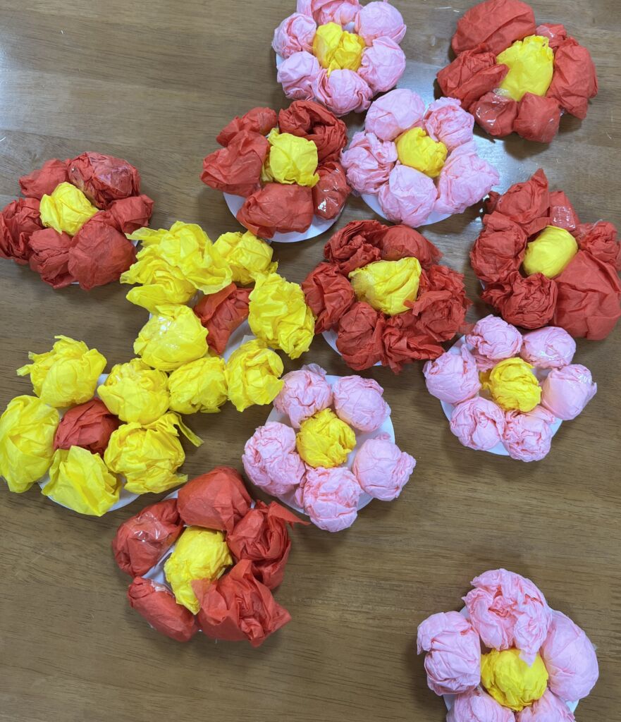 明るい春らしい色彩のお花紙をいくつも丸めて繋げたり、重ねて束ねて広げたり、楽しくお話をしながら根気よく真剣に作って頂きました。