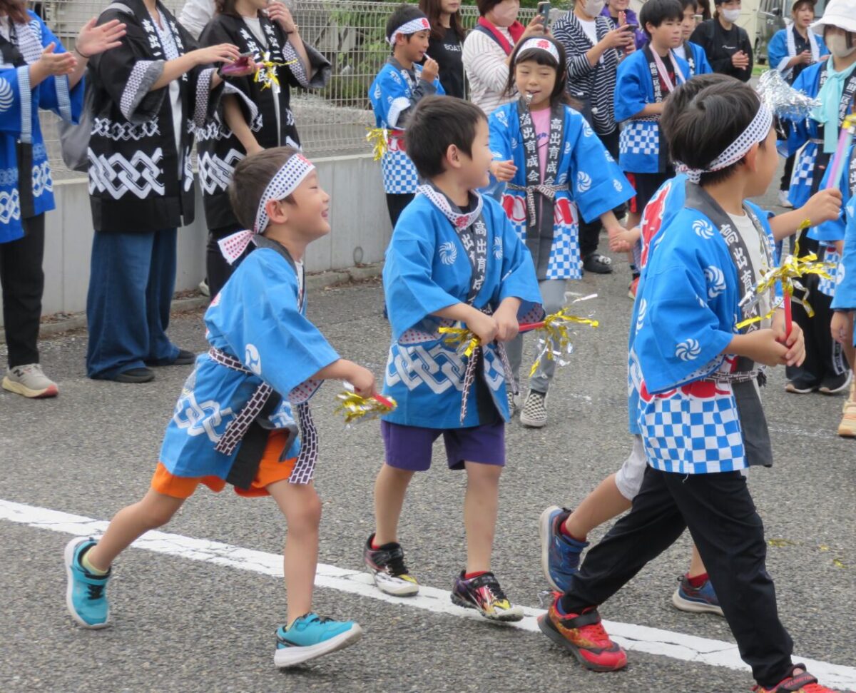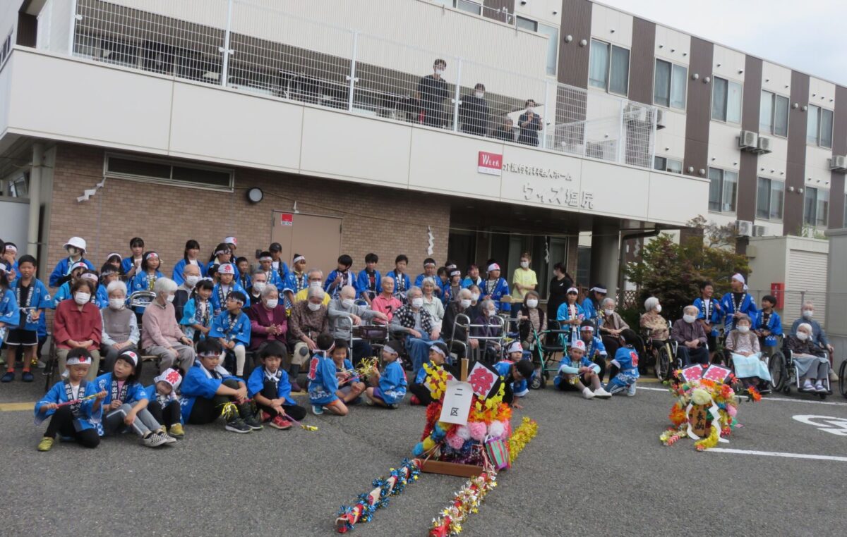 総勢60名の子供さんたちが子供神輿を担いで来てくれました。駐車場に元気な声が響き渡り、入居者様も思わず一緒に「ワッショイ!」「わっしょい!」と掛け声と手拍子で応援しました。