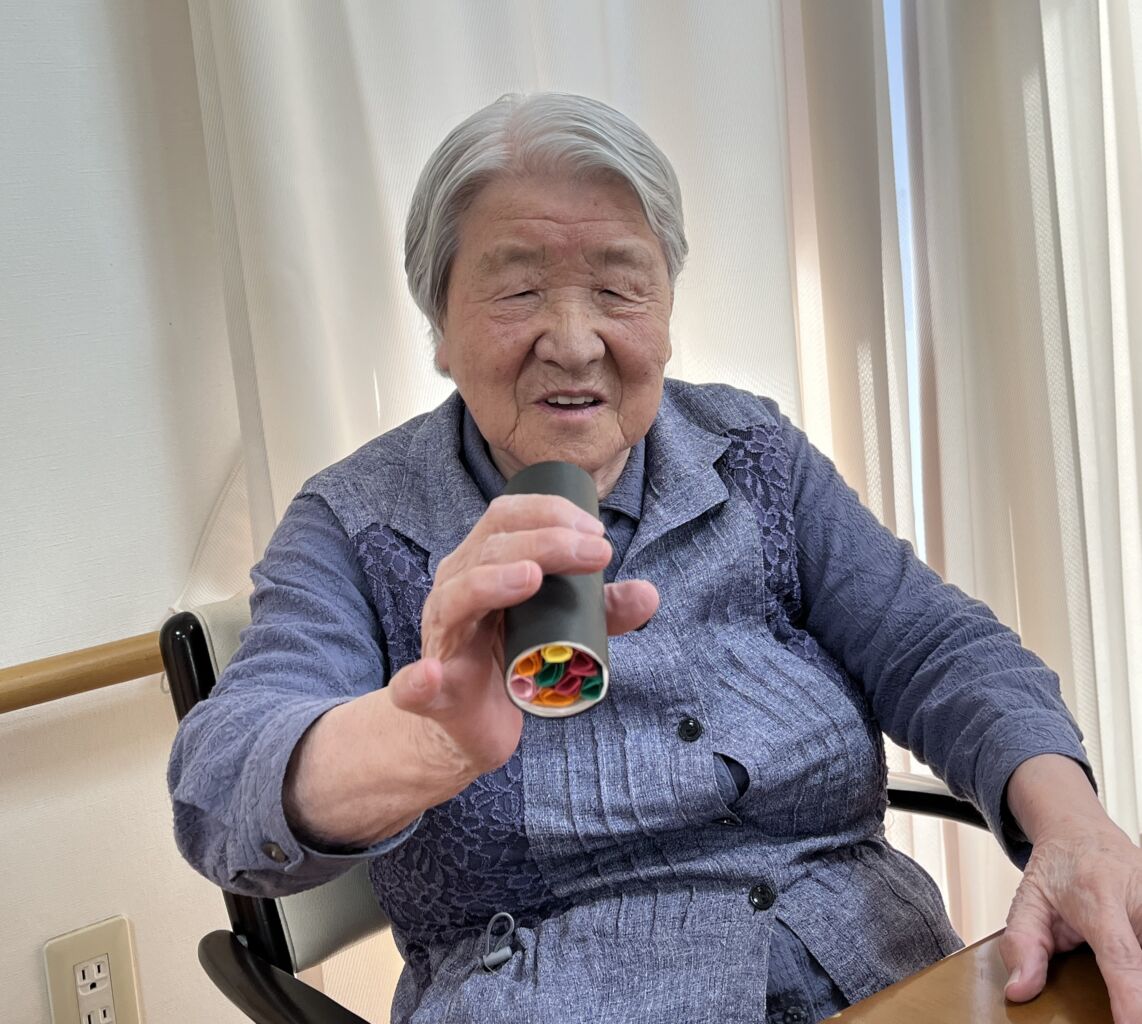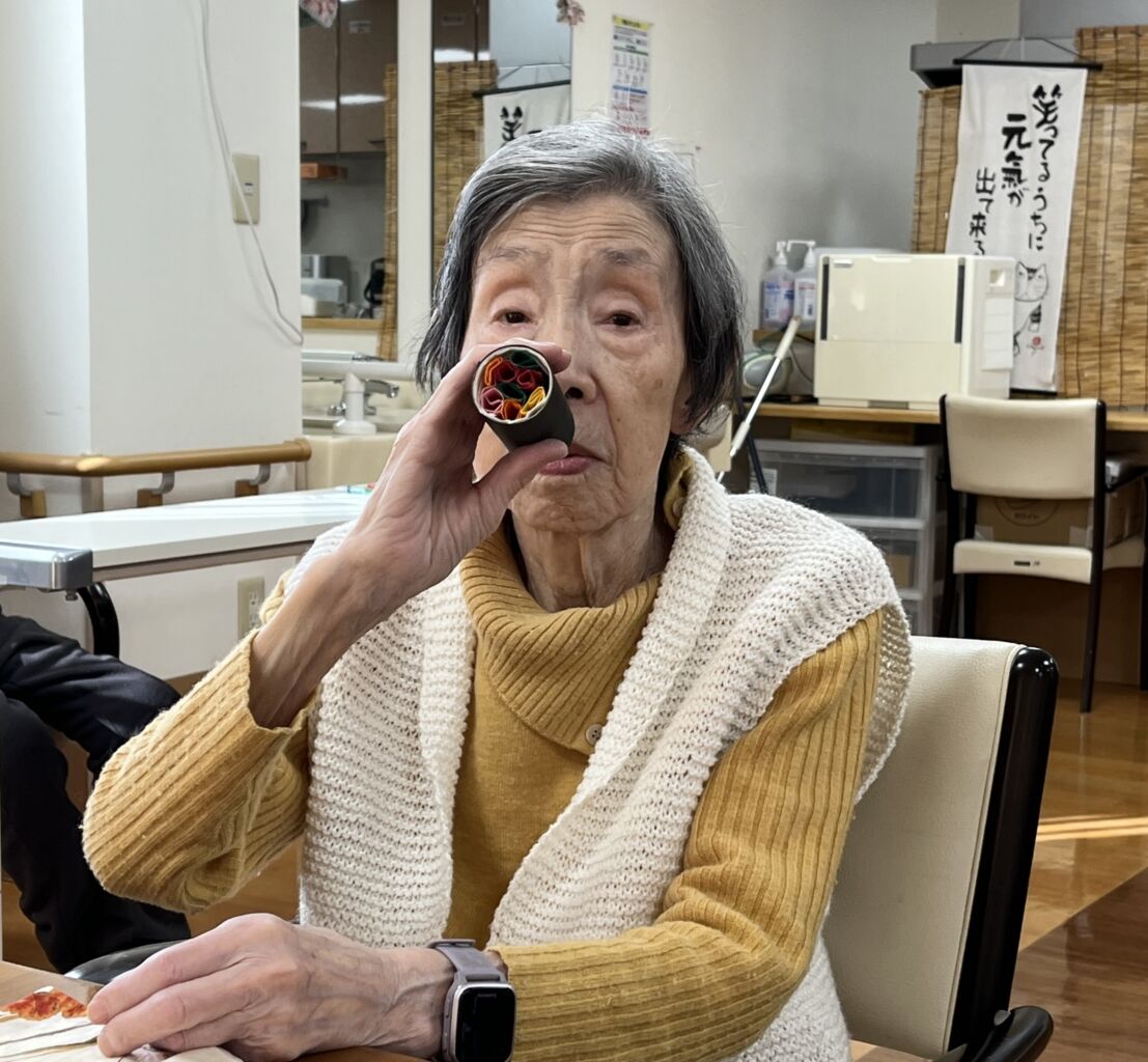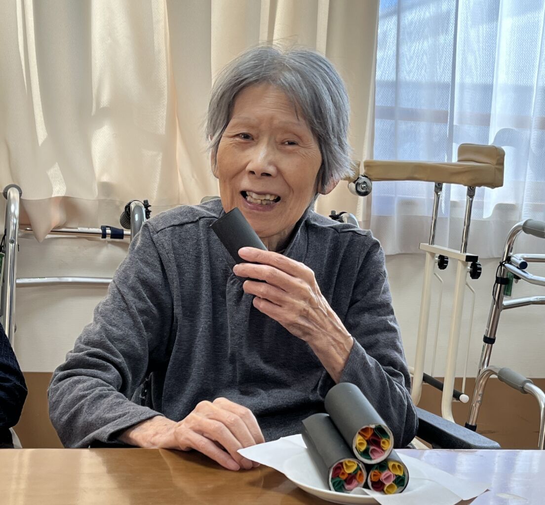 「えほうまき私が作りました!」と誇らしげに言ったのは、技能実習生のトゥインさんです。     ウィズ塩尻に来て3年、すっかり日本の季節の行事にも慣れました。本物ではないけれど入居者様に少しでも節分の雰囲気を味わっていただきたいと思い作ってくれました。