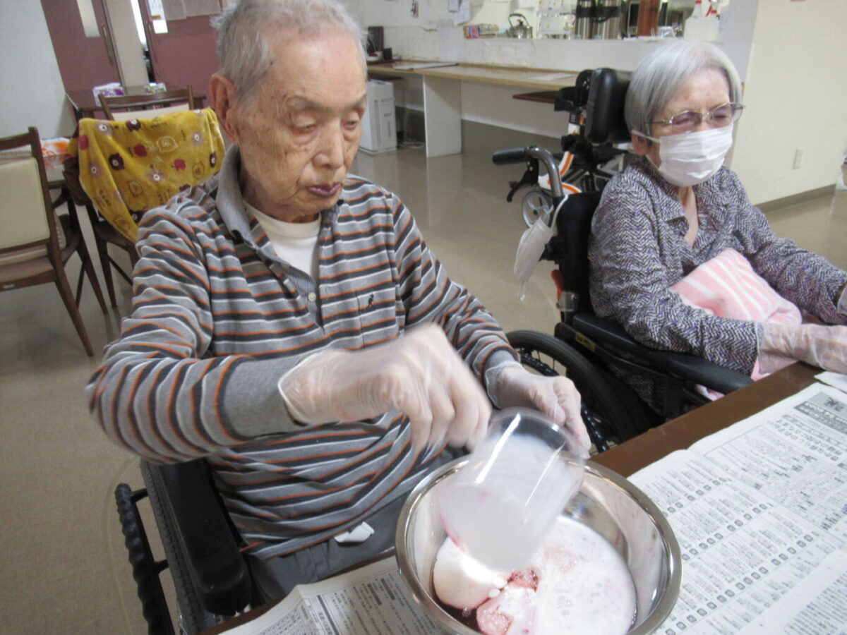 3月3日ひな祭りは各フロアでおやつ作りを行いました。担当の職員さんが一生懸命考え利用者様と一緒に作りました。