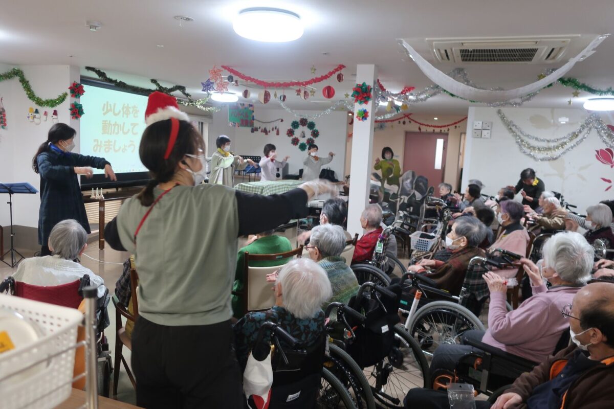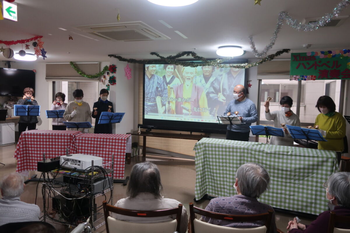 諏訪ヨンサン会という団体で、シニア大学諏訪学部を卒業した43期生の皆さんで活動している団体です。ハンドベルとハーモニカ演奏、ご利用者様と体操をしたり、歌を歌ったりもしていました。