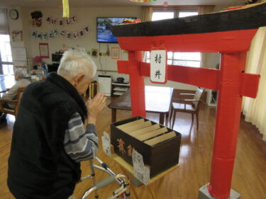 お正月はおめでたいですが、寒くてなかなか外に出る事も難しく… そんなご利用者様の為に鳥居や賽銭箱、 …